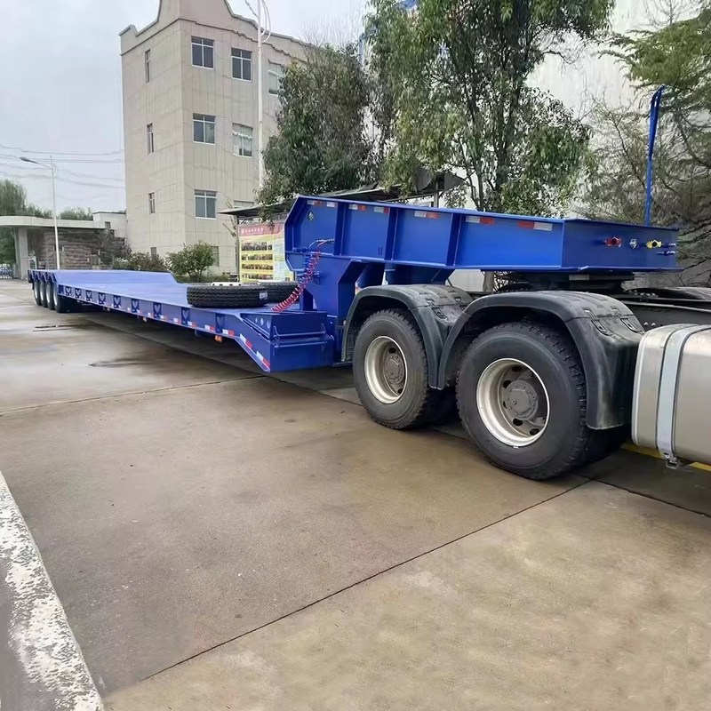 Semi-remolque de cama baja, también conocido como remolque de cama baja, remolque de cama baja, remolque lowboyNuestro remolque de cama baja elige material de acero de carbono de alta resistencia Q345B.Válvula de frenado WABCO, etc..